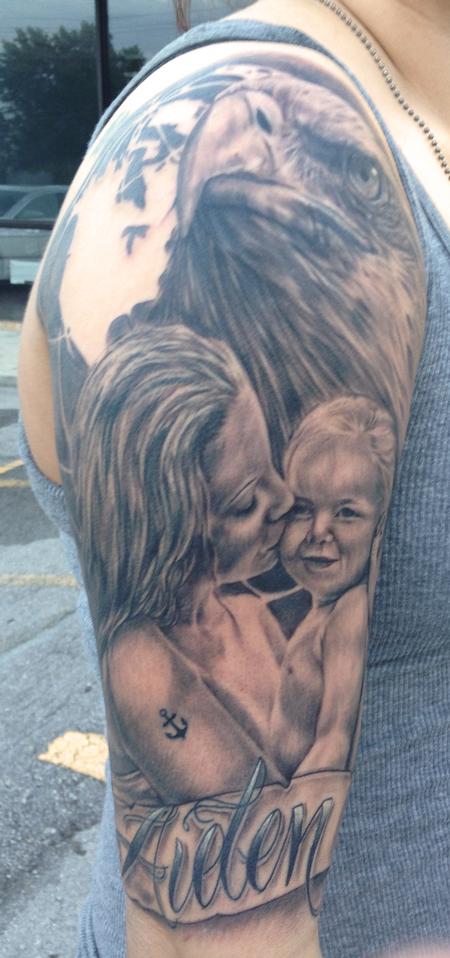 This piece was a different take on a traditional Eagle, Gobe, and Anchor Tattoo. The woman and child is to represent her and her child being her anchor.