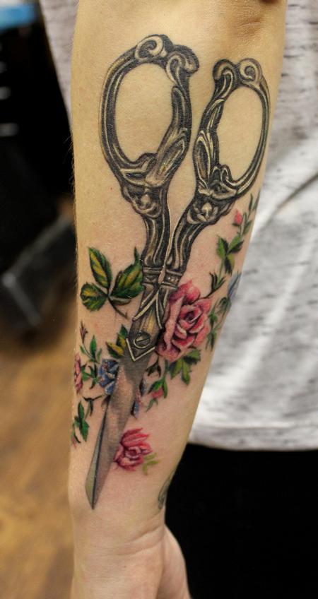 When you have a passion for fashion and design work, what better way to commemorate that love than through a beautiful tattoo? The vintage designer shears are a replica of the client's choice and are accompanied by a soft floral design to illustrate the delicacy and beauty in the work of the design industry.