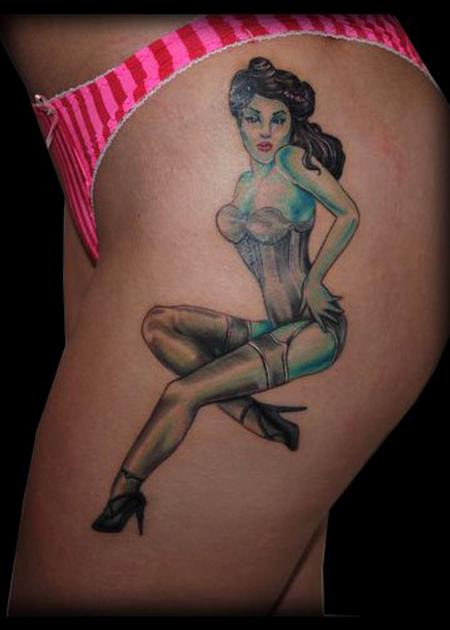 Pinup in Corset Stockings and heels placed on Hip. Background coming soon.