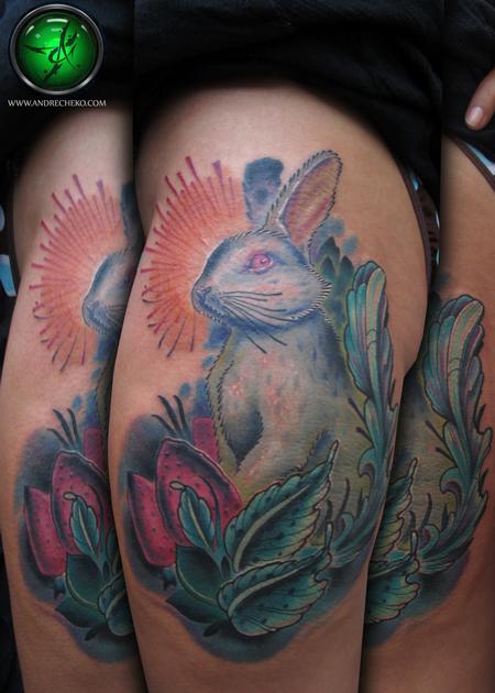 Albino Rabbit thigh color tattoo