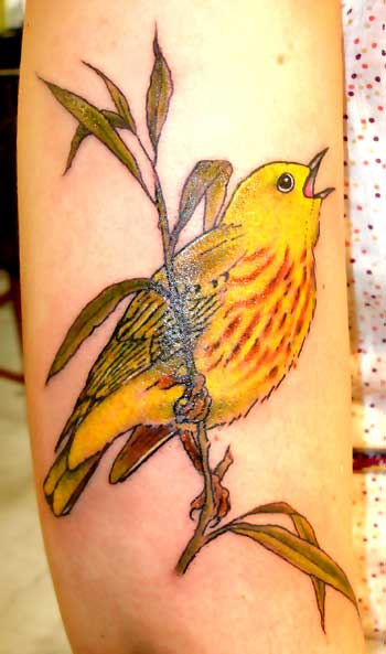 Birds are so cool to tattoo. There's all these little fine lines, and suggestions of lines, bright colors and soft transitions of grey, little details and lots interesting stuff.... This tattoo is of a Yellow Warbler, and i swear the whole time i was tattoing this little bird i kept hearing this little "warrbley-deetley-dootley-waarrble-darble-warble. But, of course, i have no idea what they sound like....