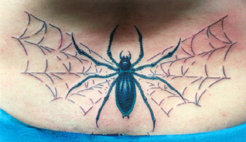 This client, Yasmine, came in asking for a lower back piece. I figured here goes another cheesy lower back tribal. Then she totally surprised me, and said she wanted a wicked looking spider as long as it wasn't a black widow. I couldn't wait to draw it and got right to work. I suggested to put a subtle web background to fill out her back more and she like it. She was tough until the end when she started getting very sore and asked to stop before I could finish the white outlines in the web. Nonetheless, I really like this piece.