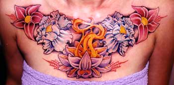 Full color chest tattoo with flowers and a lotus with flames. Yowza!!