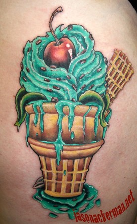 i did this tattoo of a mint chocolate chip mint ice cream cone on a friend of mine.. i had an awesome time doing this piece. it took about 5 hours to do..