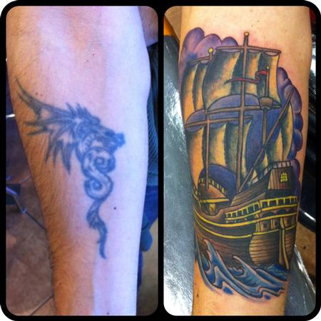 Ii did this tattoo on Frank. Hes a great guy from Italy that comes here every few months and gets tattooed on his vacations. He gave me the challenge of coerving up an old dragon tattoo he had on his forearm, and this is the out come.