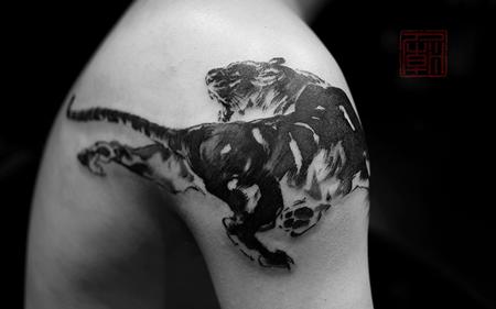Abstractly-illustrated tiger on the prowl created using Tradtional Chinese calligraphy aesthetics. Artwork and application by Joey Pang - www.tattootemple.hk / www.joeypang.com