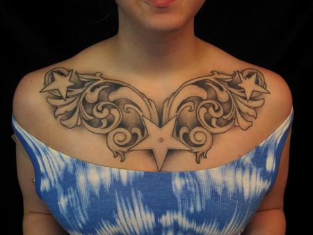 A fun simple filigree negitive space-ish black and grey girl chestpiece.