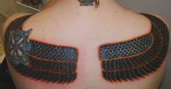 Many of my clients are magickally inclined, Nahi is a priestess of the Egyptian Deity Anpu, also known as Anubis. For a ritual she was performing this past summer, she had the wings of Ma'at tattooed on her back. Ma'at is the Egyptian Goddess of truth and justice, who weighs the hearts of the dead against the feather she wears in her crown and she works alongside Anpu, who guards the gates of the Underworld of Egyptian mythology.
