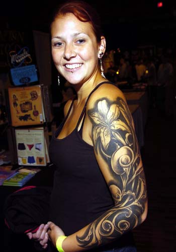 A stargazer lily scene in white against black. This tattoo was a completed in about 7 sittings and is definitely one of my favorite black and gray pieces to date. We are currently planning a new tattoo for her about twice the size of this one! She sits way better than I do!