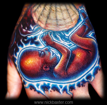 This is friend and fellow tattoo artist Anthony Plaza's hand. It represents his birth, and stuff. I didn't do the shell. Also, I almost made him regret asking me to bring the electricity down between his knuckles, judging by his award winning reactions to the pain.