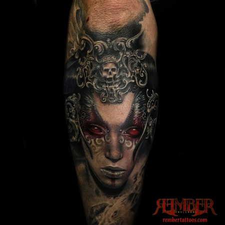 This gothic realism portrait was done on my client's lower leg, some parts are healed some are freshly added. This tattoo was done at Dark Age Tattoo Studio in Denton, Texas.