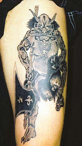 oni demon with severed heads on thigh.