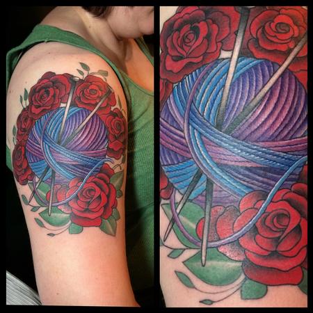 This awesome lady loves to knit! Yarn ball with Grateful Dead inspired roses.