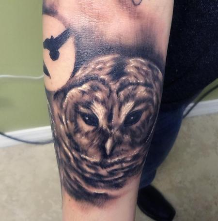 This project came about as part of a protection sleeve. Opposite the Bars Owl is a raven. These animals have a strong meaning to the collector.