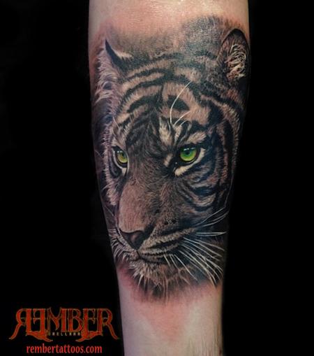 Black and grey portrait of a tiger I did at Dark Age Tattoo Studio in Denton texas. I focused on the detail of the fur and the color in the eyes makes them stand out against the black and grey shading.