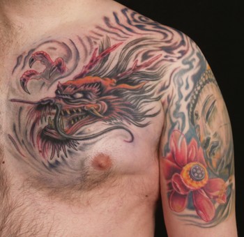 This is the 1st (Front) view of the Buddha and Dragon tattoo on Mike. This tattoo features an aggressive dragon that transitions into a smoke and wind pattern into a buddha head and lotus flower on the left arm. This is one of my favorite tattoos that I have done in a while. Mike came to me with some ideas and gave me a lot of artistic freedom. This tattoo has a really nice flow on Mikes body and the colors are very vivid and smooth.