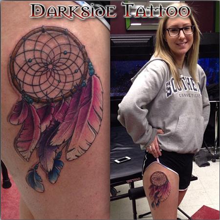 This color dreamcatcher tattoo that Mikey did on her thigh was part of an Instagram contest that he held online.