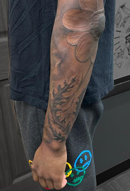 Daisy flower with bio-organic leaves tattoo. The bio-organic leaves provide a flattering fit and flow for the client.