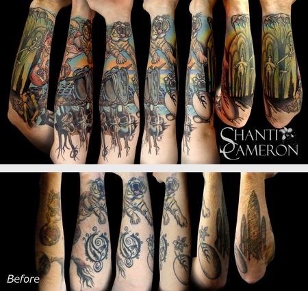 This client came in with a forearm full of random (upsidedown!) tattoos, and no longer trusted his judgement for picking or placing his tattoos. To add to the challenge, each tattoo had been done by a different artist. He had just one request - Dali; he wanted to keep the pieces that were Dali, and cover those that weren't with something that was Dali. While I wasn't able to "fix" the upsidedown nature of the tattoos, I did build in a flip at the ditch (Swans Reflecting Elephants), which will allow any future tattoos on the arm to go rightsideup. It wouldn't be Dali without being a bit different!