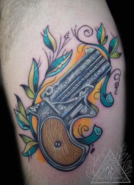 The client simply requested a derringer pistol. He gave me the freedom to do it any way i wanted to. So I did it with a new school approach. Had alot of fun with this tattoo.