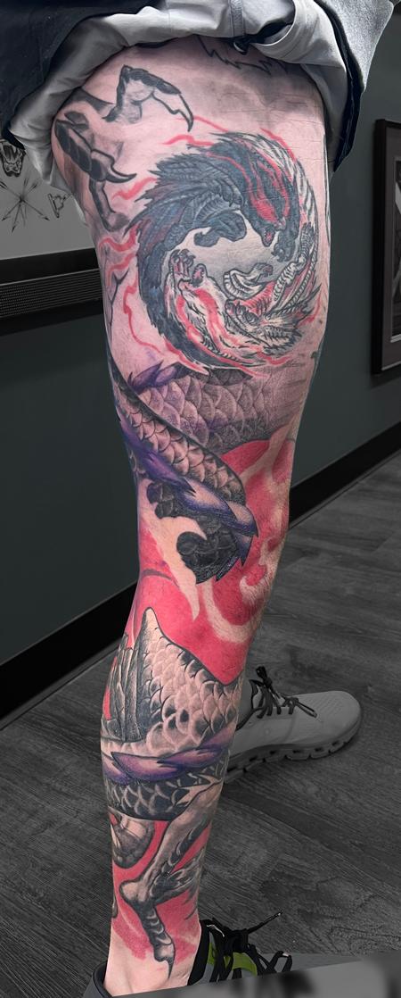 Double Dragon tattoo: two dragons and waves of blood, dragon scales, and power!