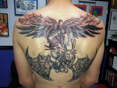 This angel stares into water to see his demon inside. This duality back piece was fun.