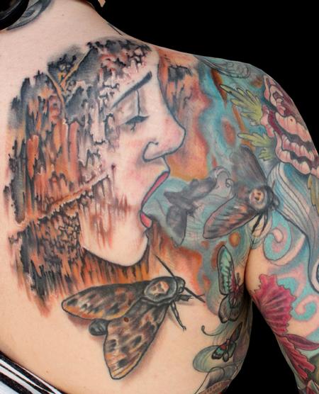 Lindsay's favorite band is Incubus and Brandon Boyd is one of her favorite human beings. We have an ongoing project going for her with a life transformation theme to it. This piece on her shoulder is 80% of the painting by Brandon Boyd titled "Ectoplasm."