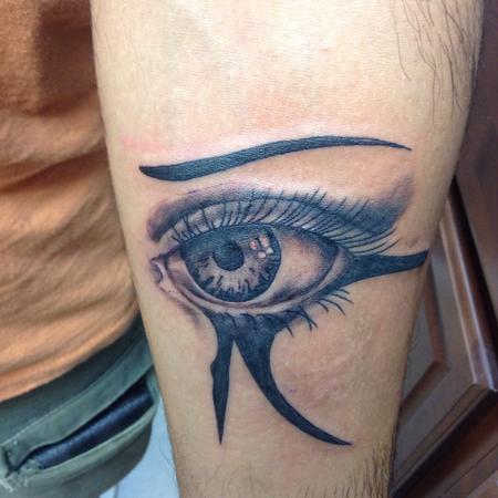 A stylized Egyptian eye tattoo with eye of ra eye makeup.