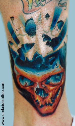 This is my half of a tattoo trade with fellow tattoo artist Julio Rodriguez, and a semi-experiment with a very bright, high-contrast light source and photographic focus/blur effects (sharp focus eyesockets and cranium, blurred out jawbone).