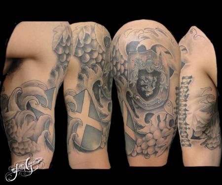 Dan wanted to combine both sides of the family by using the crests and then combining grapes and water waves.
