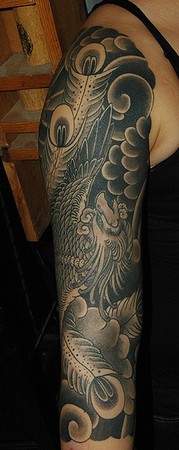 front view of phoenix with clouds japanese sleeve tattoo