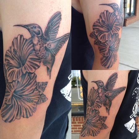 This custom humming bird and hibiscus tribute honors his wife AND covers up two scars he felt were unsightly.