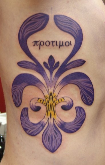 This Fleur de Lis tattoo takes up the entire rib cage and is colored like an iris throughout. A unique approach for the fleur de lis theme, I really enjoyed this tattoo a great deal!