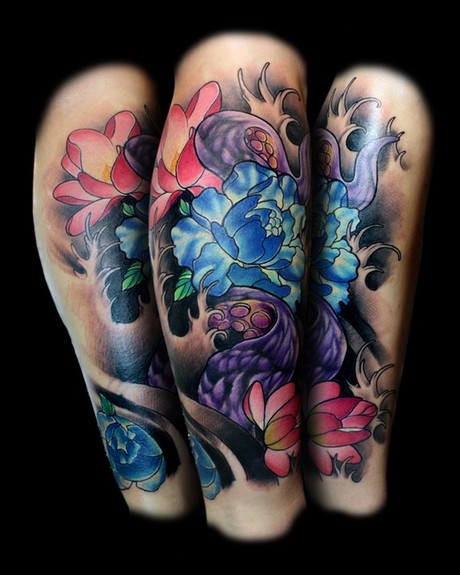 Full view of the entire finished tattoo. Cover up tattoo of Japanese flowers and an octopus tentacle. One session, 7 hours.