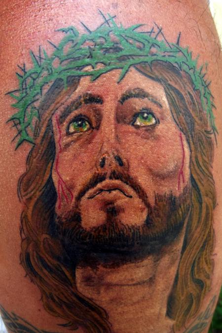 Color portrait tattoo of Jesus Christ. I really had alot of fun doing this and the client was thrilled.