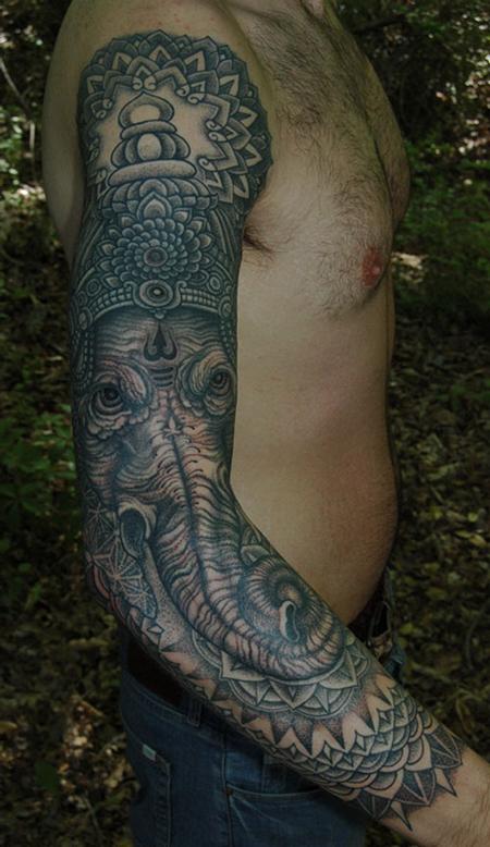 Dana Helmuth black and grey sleeve featuring hindu deity ganesha, son of shiva, with full mandala background, dot work stipple shading and sacred geometry
