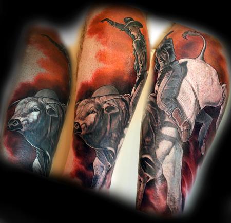 This was a classic case of a client who wanted an image that didn't fit the area requested. He wanted a photo of a bull rider and bull on his outer calf. The shape of the image was very horizontal while the shape of the available area for the tattoo was much more vertical being on the side of the calf. In order to adjust without making the image too small I freehanded the image with a small amount of foreshortening adjustments in the design. Once the freehand version was done I took it back to the drawing board in order to make it as realistic as possible. Sometimes a little extra effort goes a long way in making a client happy.