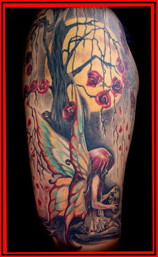 Half sleeve tattoo done in 2 sessions. Fantasy fairy with a little dark side to it.
