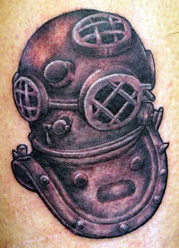 a traditional "mark5" helmet for a navy diver...being his first tattoo, he got it smaller than what I wanted to do, but none the less, I know he was excited and happy with the finished product...