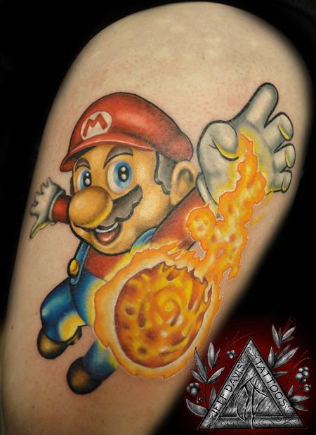 Mario throwing a fireball. This tattoo was originally drawn for another client and he did not like it but I did so just had to tattoo it. And now its one of my favorite tattoos Ive done.