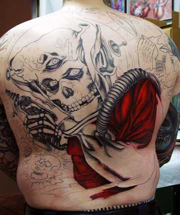 Here's an updated picture of the Missfits Mars attacks back piece. IM thinking this may take awhile. That field of red is nearly 25% of his back, and thats alot of red. Keep an eye peeled for updates.