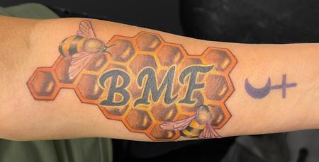 Bees and honeycomb tattoo. We added bees and honeycomb to a pre-existing tattoo, updating and integrating it.