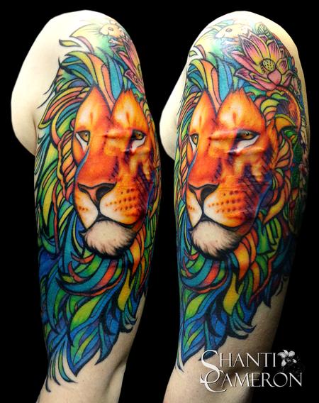 This is an in-progress shot of an amazingly colorful lion half-sleeve that is also a cover-up of an old tattoo and heavy scarring (in different locations). She had a rough idea of what she wanted, and let me run with it...talk about fun!