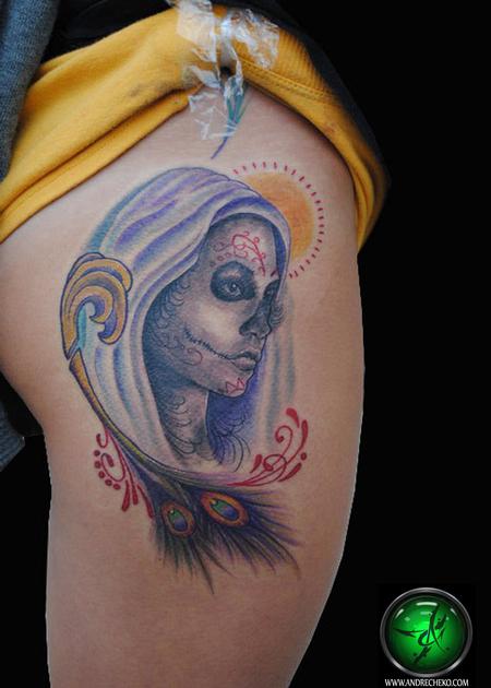 Day of the dead tattoo incorporating both color and black and grey.