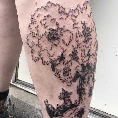 It feels natural doing etching/crosshatching/woodcut illustrative tattoos. I had sooo much fun with this one, original art by Richard Lawson. I'd love to do more tattoos in a style like this. This is the beginning to a half sleeve on Jessica's leg of Ferdinand the Bull, eventually most of the story will wrap around her leg! :D