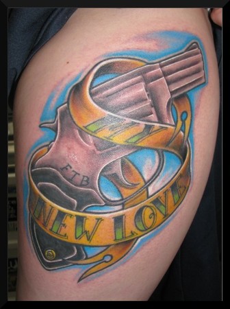 Taurus .357 revolver tattoo with banner on my wifes thigh.