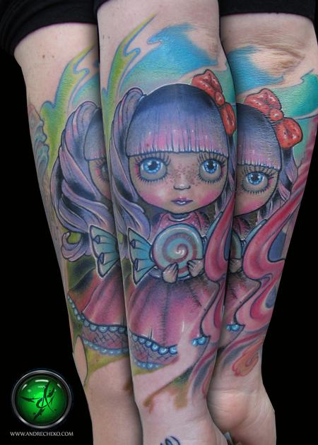 Blythe doll color arm tattoo, this piece is part of a sleeve tattoo in progress... itsalways fun doing colorful pieces. this tattoo was done at the Boston tattoo convention in 2012.
