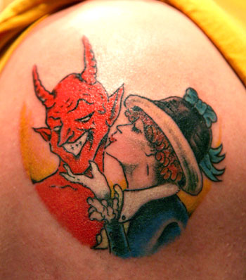 This tattoo pretty much speaks for itself. A tattoo that smacks of wry wit and suggestive audaciity. The original inspiration for this tattoo was a turn of the century postcard. Ah, those were the days: when ladies were ladies, and gallantly rakish ne'erdowell's could woo said ladies right out of their hoop skirts. A nod and a wink..."oh you devil".