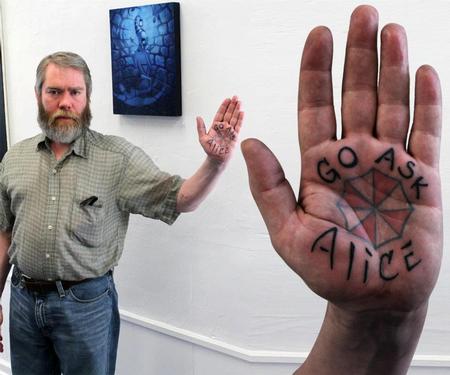 Tom had me tattoo this Umbrella Corp. Logo from the Resident Evil film and video game franchise. Then he we added the lettering "Go ask Alice", referencing the protagonist of the the film series, as a response to those who questioned why he has an Umbrella Corp. Logo tattoo in the palm of his hand.