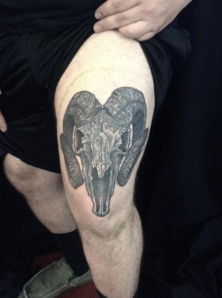 A Ram Skull cover up tattoo on a thigh. This tattoo is about 9 inches by 12 inches.